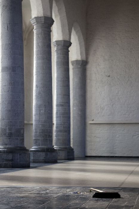 Die Aula Karolina, eine ehemalige Klosterkirche in Aachen, wird gerne für Vorträge, Ausstellungen o.ä. genutzt. Hier ist die Veranstaltung gerade zuende, und die letzten Aufräumarbeiten sind im Gange.