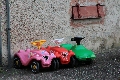 Drei säuberlich aufgereihte Bobby-Cars in Kirchzarten. Nein, ich habe sie nicht arrangiert, die standen genau so da, als ich abends dort vorbeikam, und ich habe nur auf den Auslöser gedrückt.