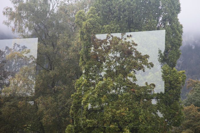 Blick aus einem Fenster in den Park, und im Fenster spiegeln sich die Fenster der gegenüberliegenden Wand. Das Verblüffende ist, wie nahtlos sich die gespiegelten Bäume auf der anderen Hausseite in die des Parks einfügen. Nur an ganz wenigen Stellen sieht man Inkonsistenzen.