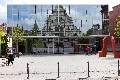 Der neue Anbau des St.Leonhard Gymnasiums in Aachen. In seiner Glasfassade spiegelt sich die orthodoxe Kirche - ein starker Kontrast.