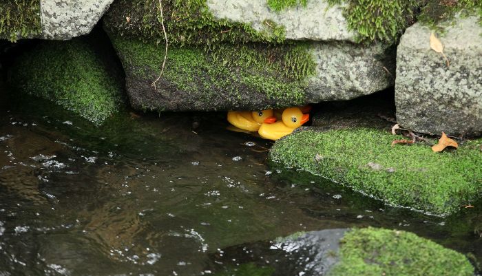 Beim jährlichen Entenrennen in Kirchzarten gibt es immer ein paar besonders ängstliche Exemplare, die sich unter Steinen verstecken.