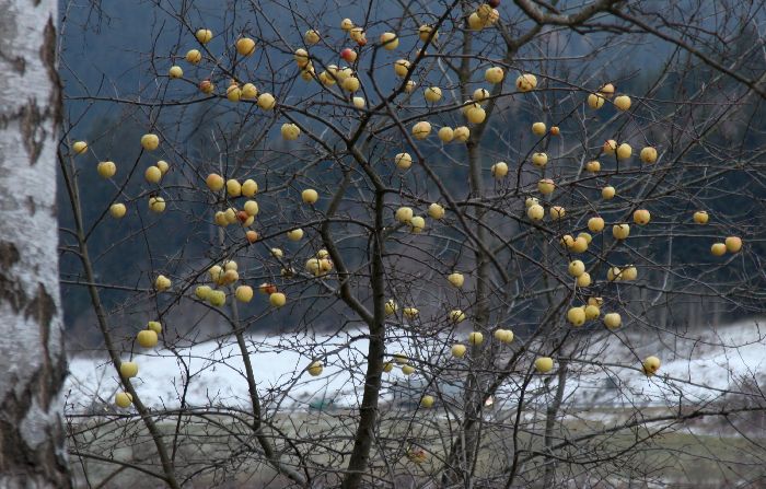 Ungewöhnlicher Anblick in diesem Winter: Bäume voller Äpfel, aber ohne Laub.