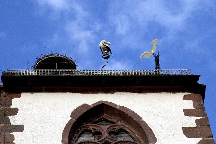 Storch und Wetterhahn auf dem Kirchturm in Kirchzarten