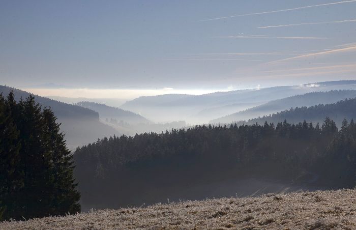 Nebel in den Niederungen des Schwarzwalds, dichte Wolkendecke im Oberrheintal und wieder freie Sicht über den Vogesen ganz im Hintergrund.
