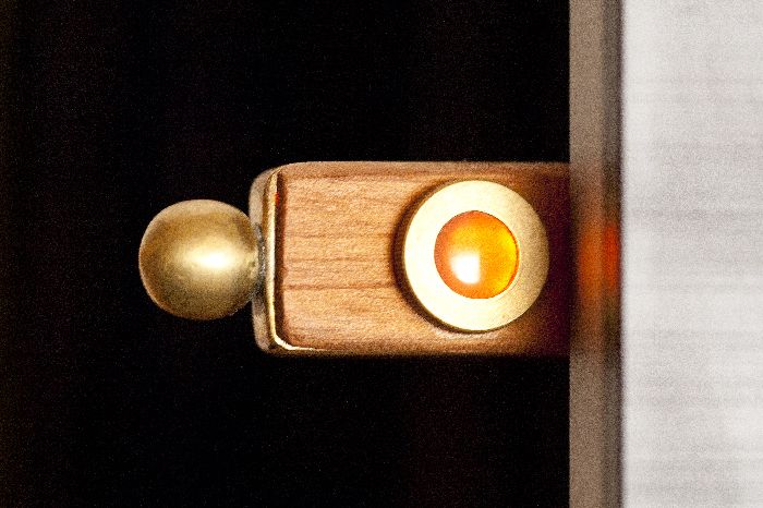 Im Inneren des Sticks werkelt eine rote LED, am Reflex auf der Gehäusekante ist das erkennbar. Aber die Streuung in der Achatscheibe, die als "Fensterglas" dient, liefert ein orangenes Licht.